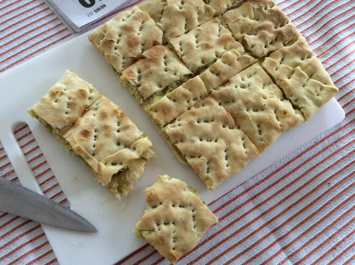 Using a mixer with a dough hook, combine the flour, egg, some oil and water and mix and make the dough. Roll out the pastry using a rolling pin, long enough to hang over your baking dish or tray. We use one that’s about 40cm wide. Place the long pastry onto the oiled dish and fill with the leek and potato mixture. Wrap it up using the overhanging pastry. Brush the top with olive oil and with a fork prick the top of the pastry. Cook in a pre-heated oven 180-200°C for about 30 minutes or until golden brown. Remove from oven and cool on a wire rack. Can be served hot or cold. Serves 6-8. (Or just 1 – me!)