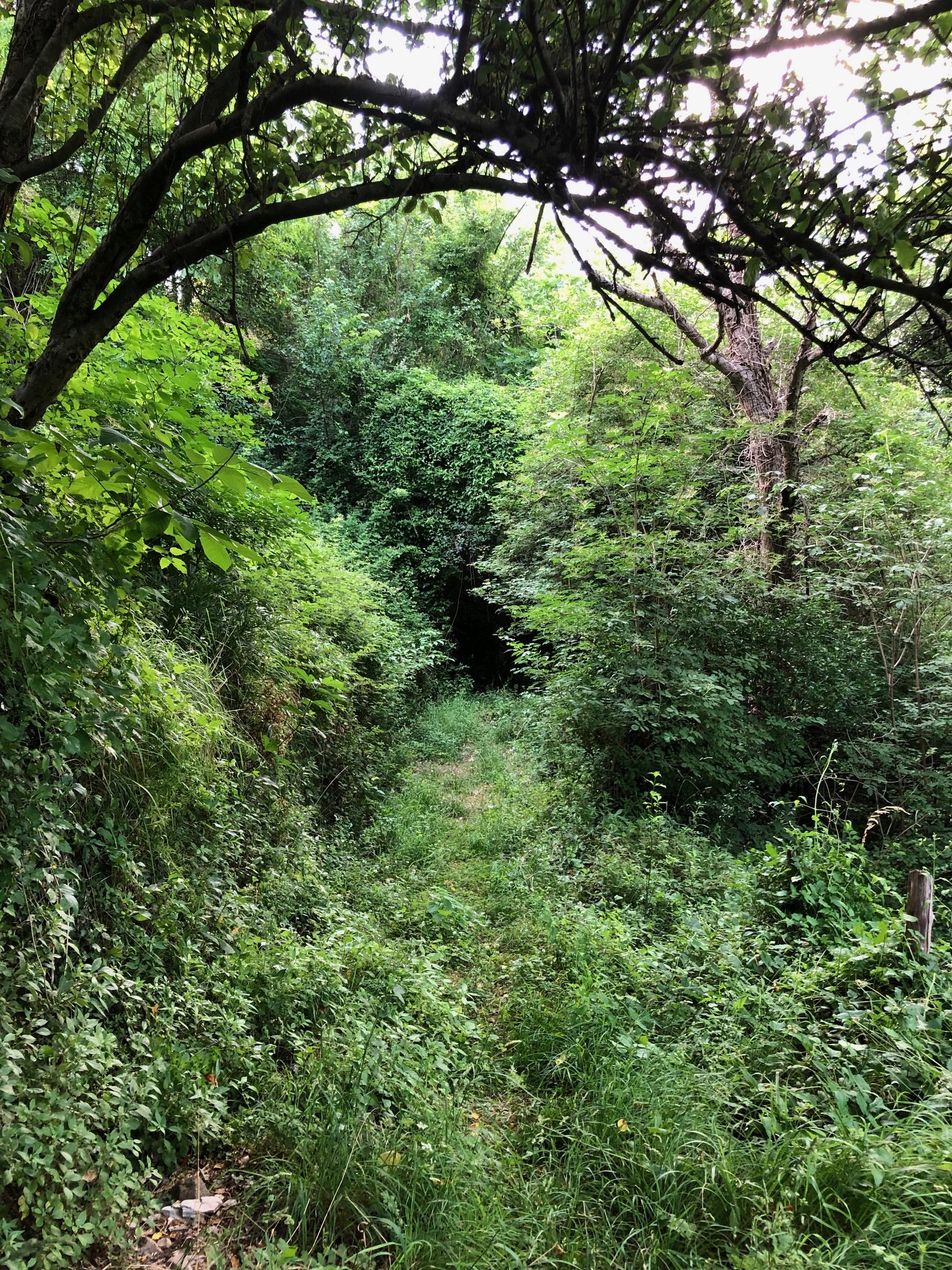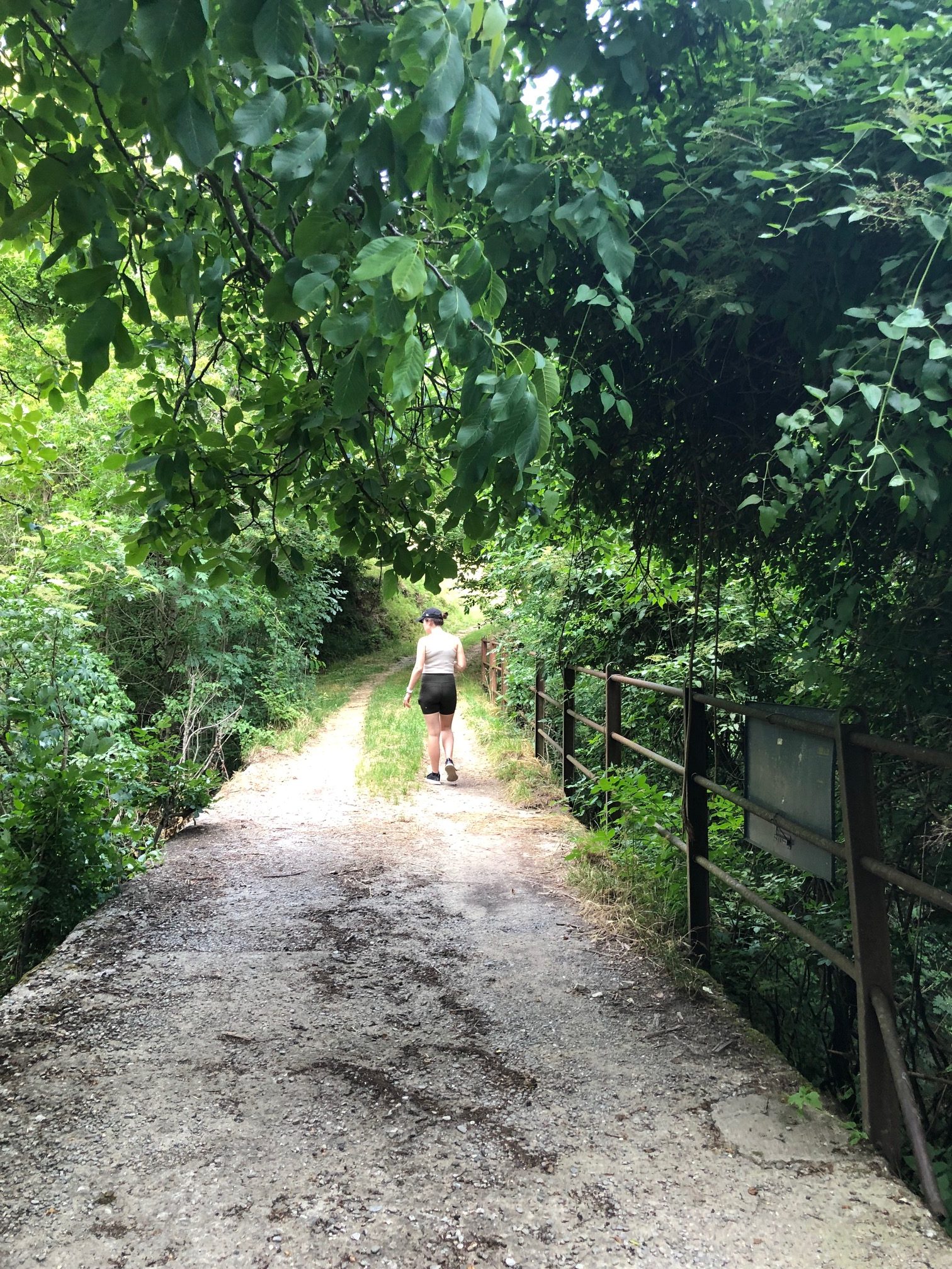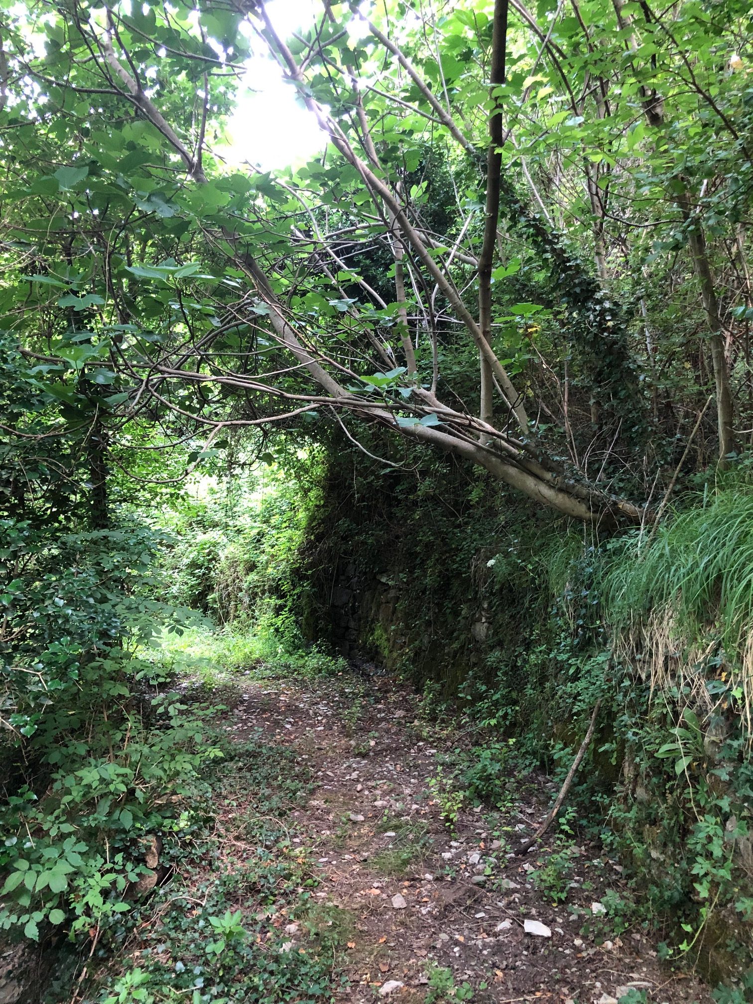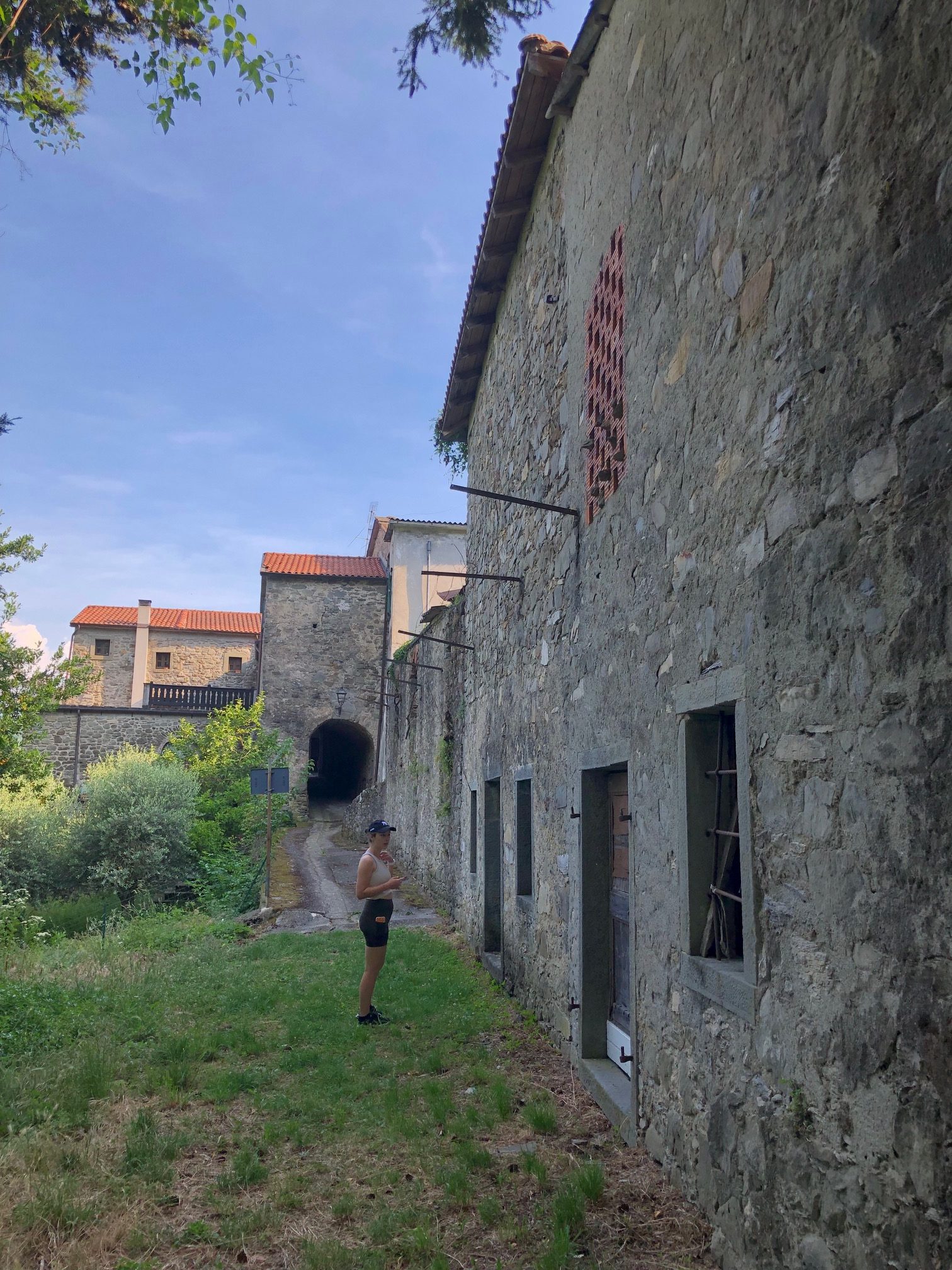 As we got to the end we noticed the large abandoned ruins of stables and once homes and the overgrowing greenery of the forest creeping into the village. Marina directed to us the way to find the river, although she explained that it might be too difficult to find due to how much the vegetation had become overgrown and the path imboscato (hidden in the forest) as no one has been there in decades like there used to be, and that the lavatoio had been partially broken and unrestored. In eagerness to find something, Kyla and I left Marina and began our walk to discover something. The further we walked the higher the grass became, the lower the branches of the trees dropped and the louder the sound of nature got as we stepped further away from the village. The path was there but looked worse further ahead, almost with the need for tools to cut through it. We came across trickles of water heading down the slopes and sensed we were near but returned due to our unpreparedness and the bearing heat of the day. As a bush walk for another time, we decided to head up the hill to try the road that Marina had mentioned as another possible path.
